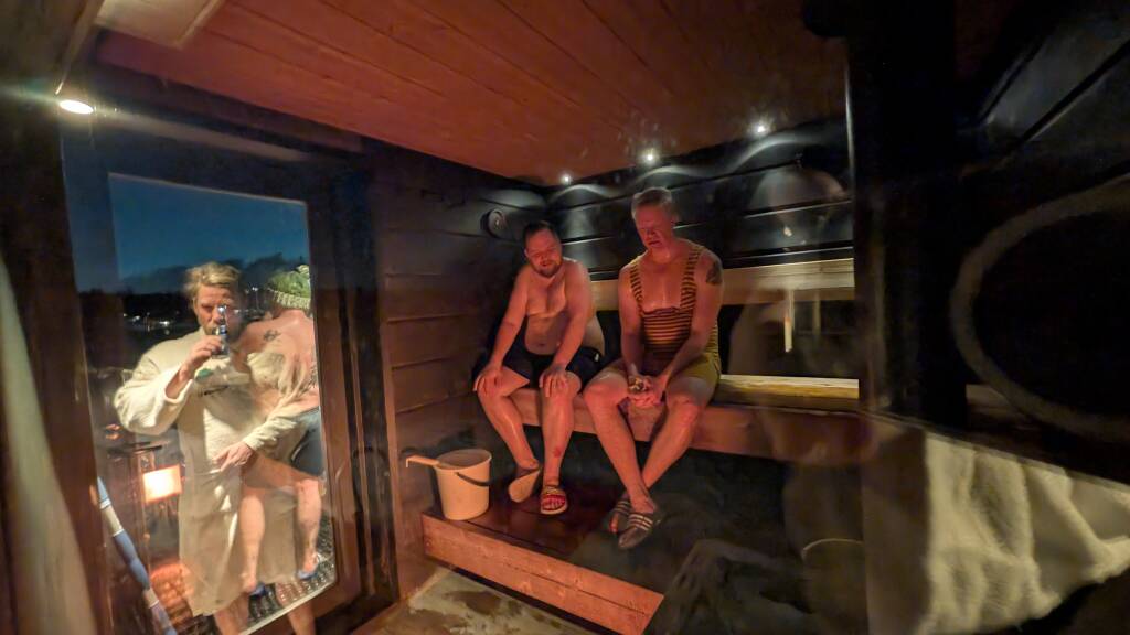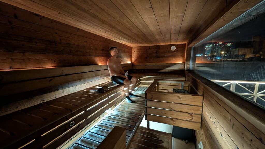 Kun pääsimme hotellille noin kuuden aikoihin, koko keho tuntui jääkylmältä. Onneksi olimme varanneet tunnin saunavuoron, jotta pääsimme lämmittelemään ja peseytymään saunamaratonin jälkeen. Kun ruumiinlämpö oli palautunut normaaliksi, laitoimme vaatteet päälle ja suuntasimme saunamaratonin jatkoille – tanssimme ja nautimme loppuillan täysin rinnoin.